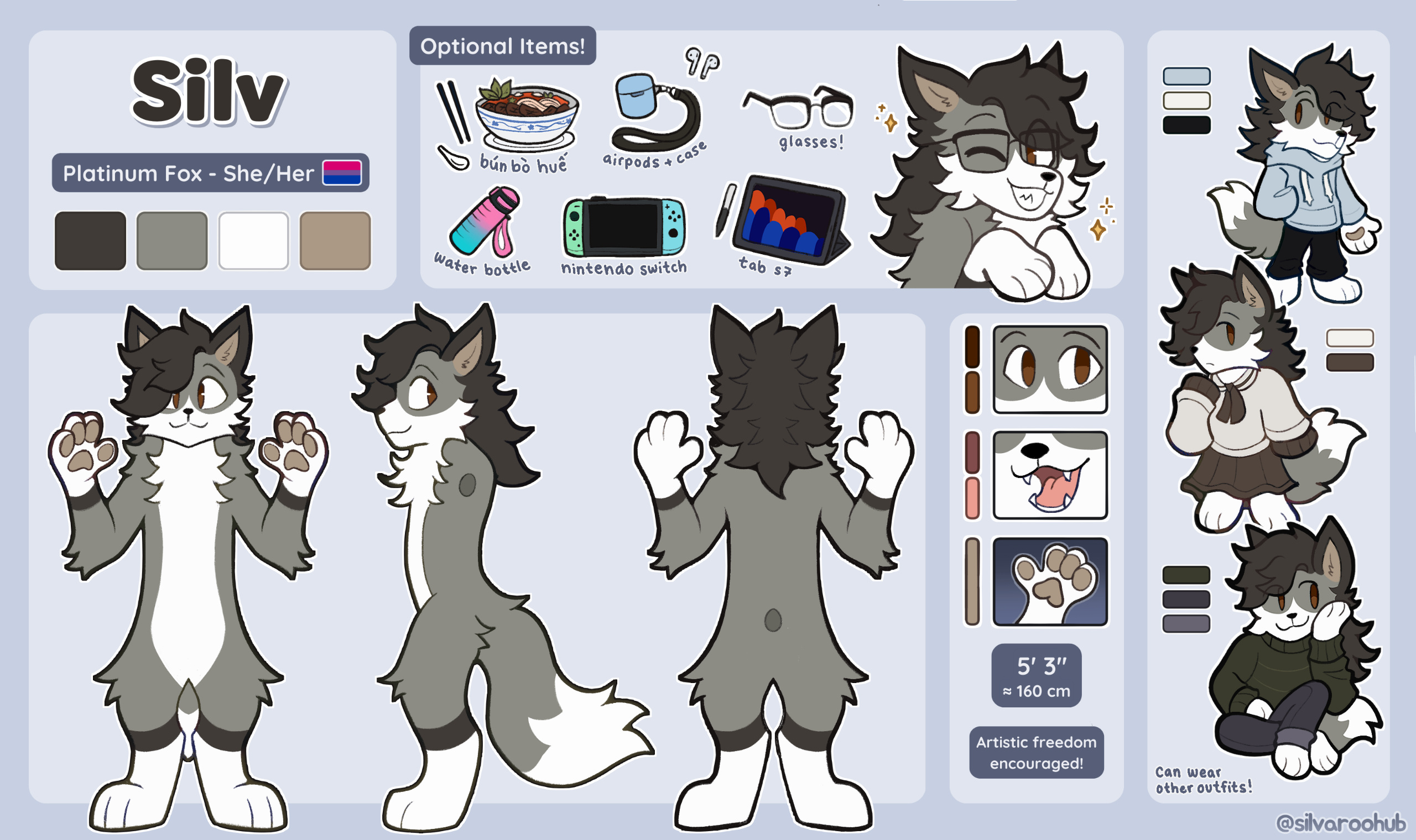 If you're ready for a commission, go to my Ko-fi or DM me with further details: send your reference sheet(s), expressions, details, and payment method! I am most active on Discord, Twitter, Bluesky, and Instagram! You can find me by typing @silvaroohub!